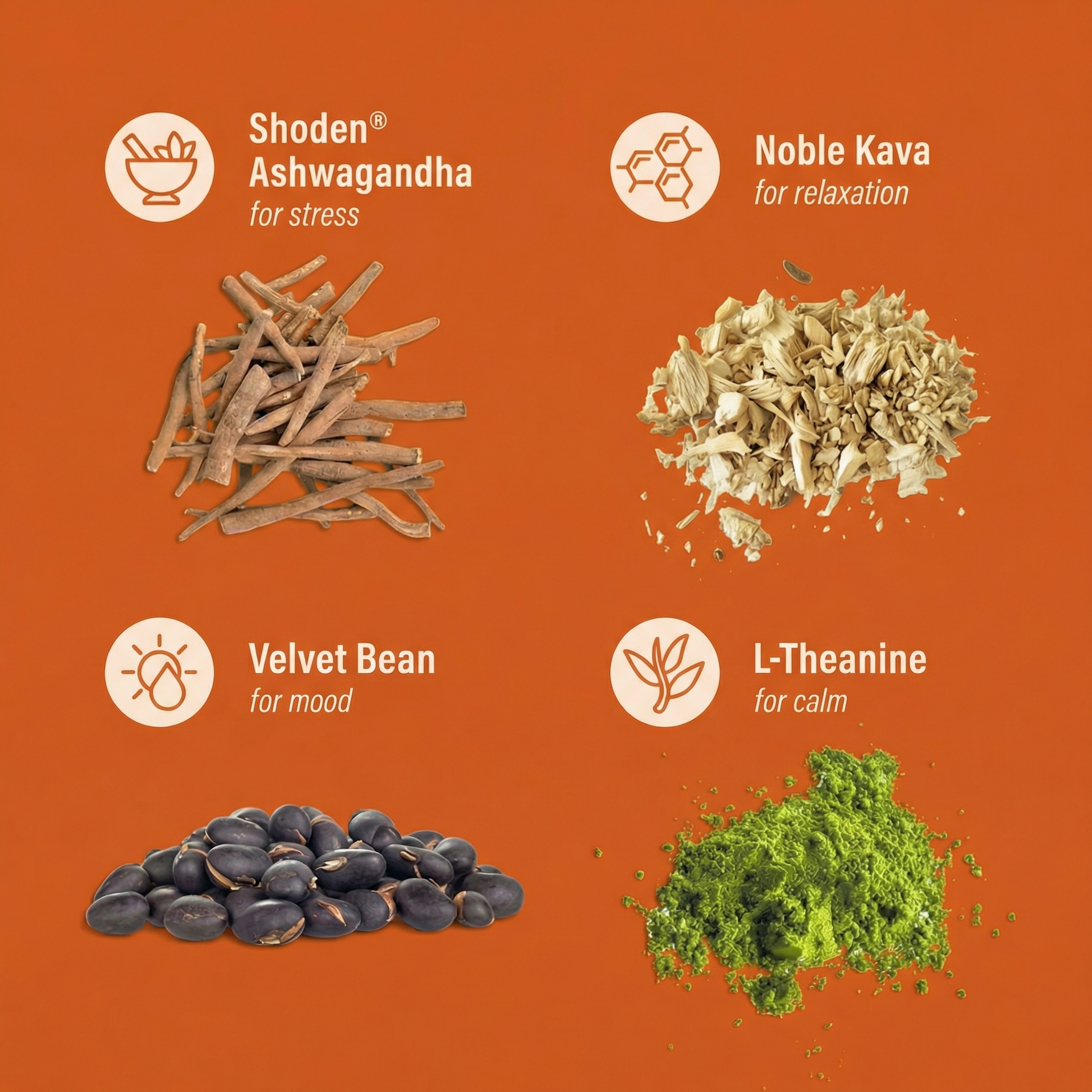*Based on peer-reviewed human clinical studies on key ingredients, including shoden ashwagandha, L-theanine, kava, and velvet bean extract. Individual results may vary.