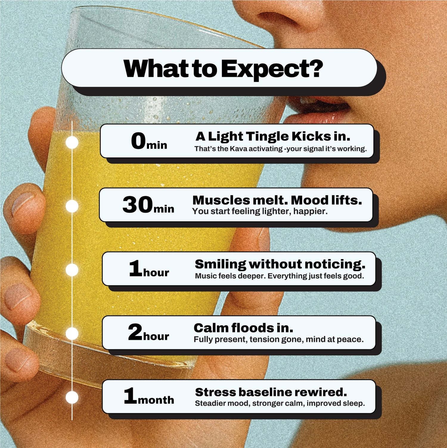 0–5 minutes: A light, tingly numbness in your mouth - that’s the Kava kicking in. It’s your first sign something’s happening.